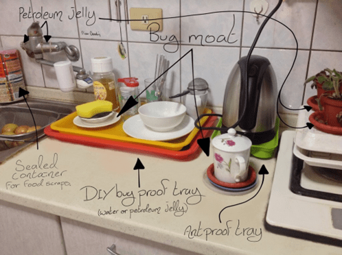 Don’t leave areas of standing water (various creatures such as ants and cockroaches may survive by drinking the water).