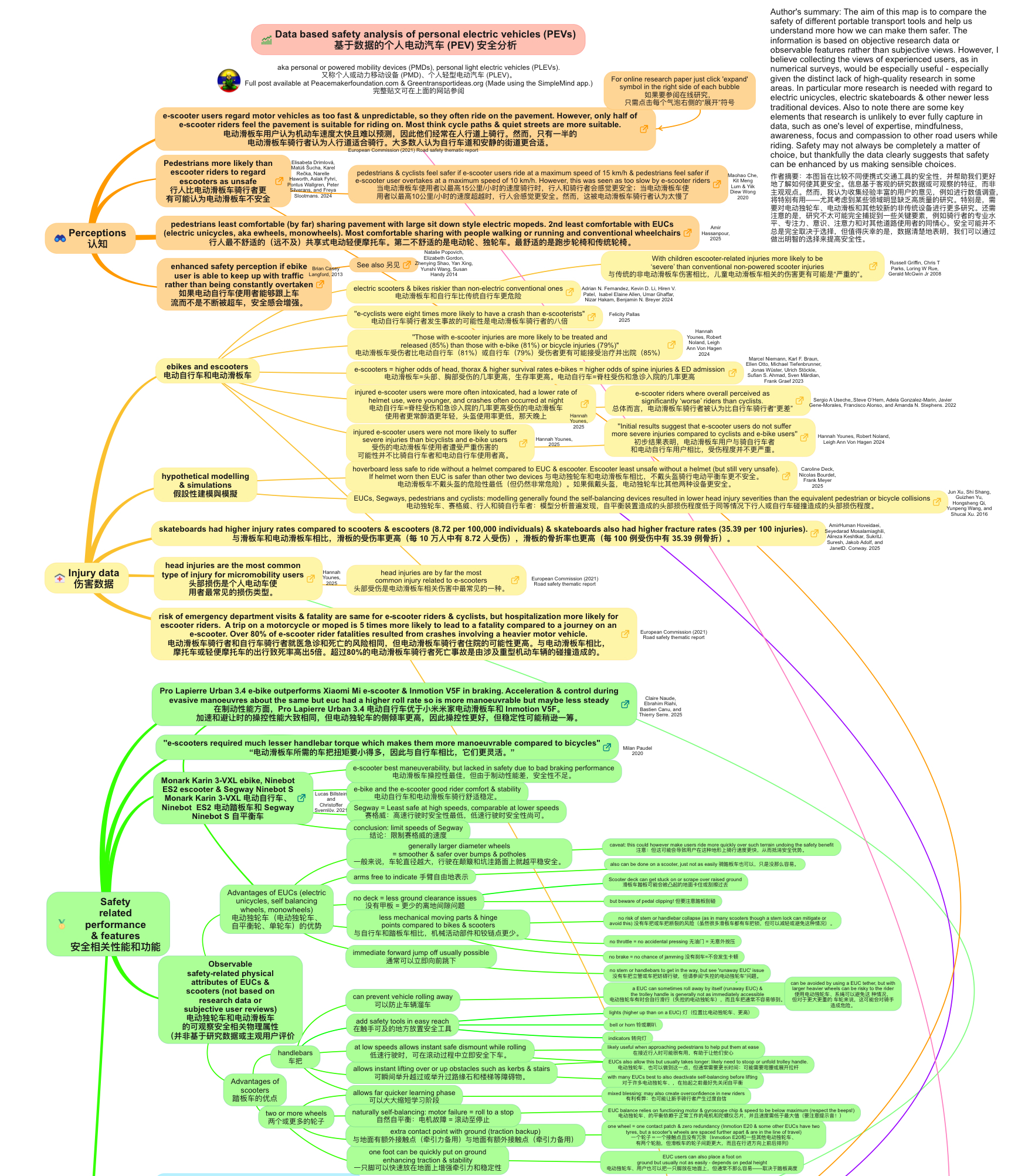 对我个人来说,当我看到汽车造成的严重碳排放和污染时,我只想看到更多绿色交通,尤其是个人电动交通工具(PEVs),它们通常比大型车辆更节能。我觉得我们需要想办法提高安全性。这个图示是一个通过提升理解来提供帮助的尝试。另外,我认为制造商应少一些对速度的关注,多一些对安全的关注,同时增加更多自行车与滑板车专用道路以及主动出行路线,也会在这方面带来很大帮助。