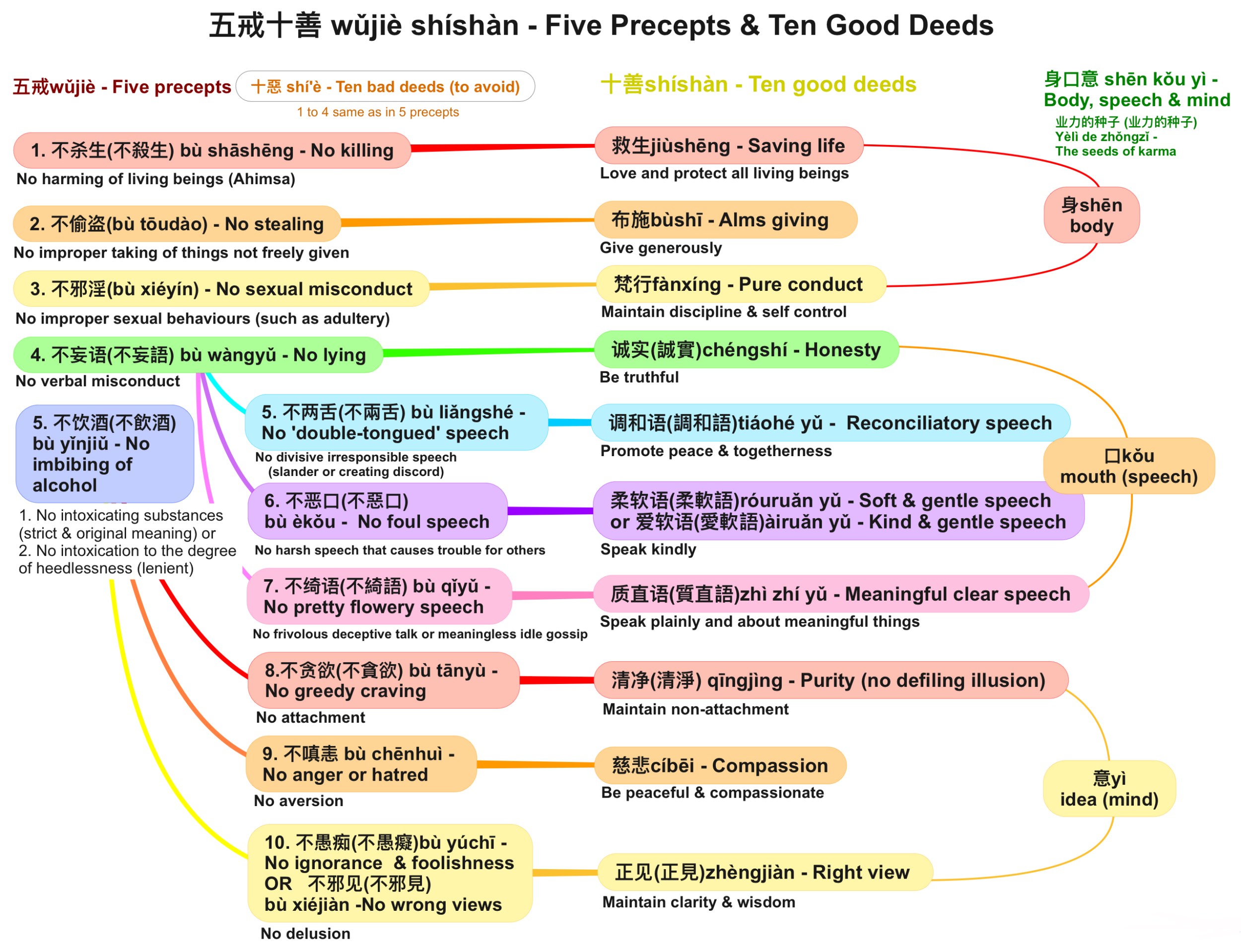 A visual summary of the five precepts and ten good deeds in the Buddhist tradition. This has not yet been checked by a qualified teacher and is based on my own limited understanding and some online research. If you see any mistakes feel free to let me know. Hope it helps!